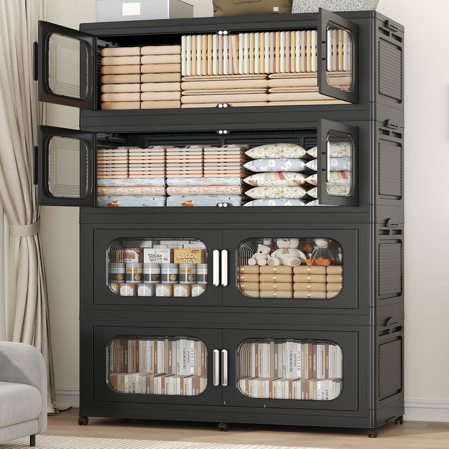 • 【Dual Way to Access - Magnetic Doors & Clear View】Two ways to retrieve your items with ease through both the top lid opening and magnetic door front opening. The clear windows on the storage box let you quickly identify contents without opening the bin. Strong magnetic latches keep the door firmly closed. The folding storage bins with doors protect delicate clothes, documents, or seasonal decor from dust and moisture.