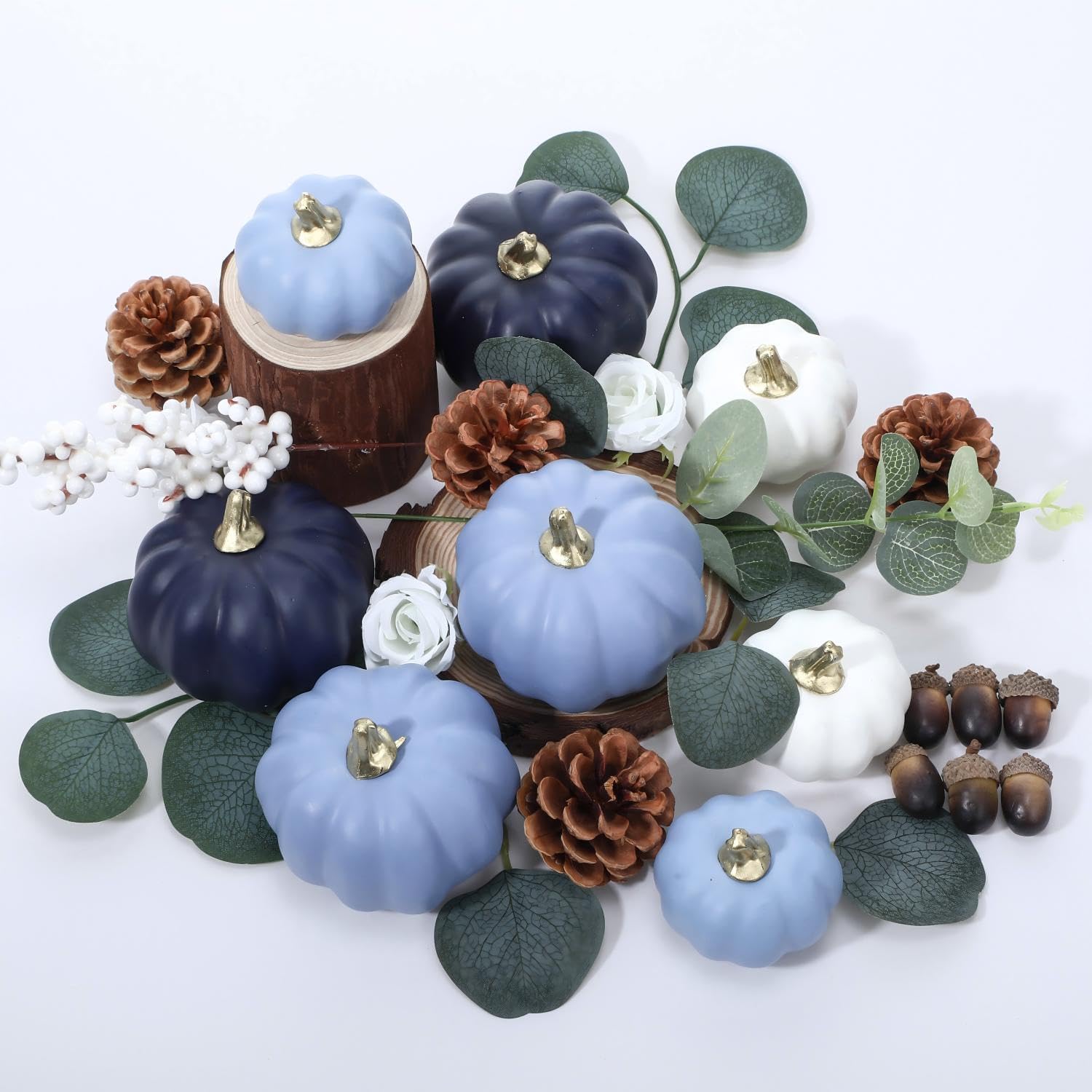 Features: The lifelike and realistic looking fake maple leaves, cones and Artificial pumpkins will greatly increase the atmosphere of all festivals. Specifications: Material: silk Color: white, gold, green, black Package includes: 8 x Pumpkins 3 x White berries 32 x Eucalyptus leaves 4 x Pine trees 3 x Roses 6 x Pine acorns Notes: Manual measurement, please allow slight errors on size. The color may exist a slight difference due to different screen displays