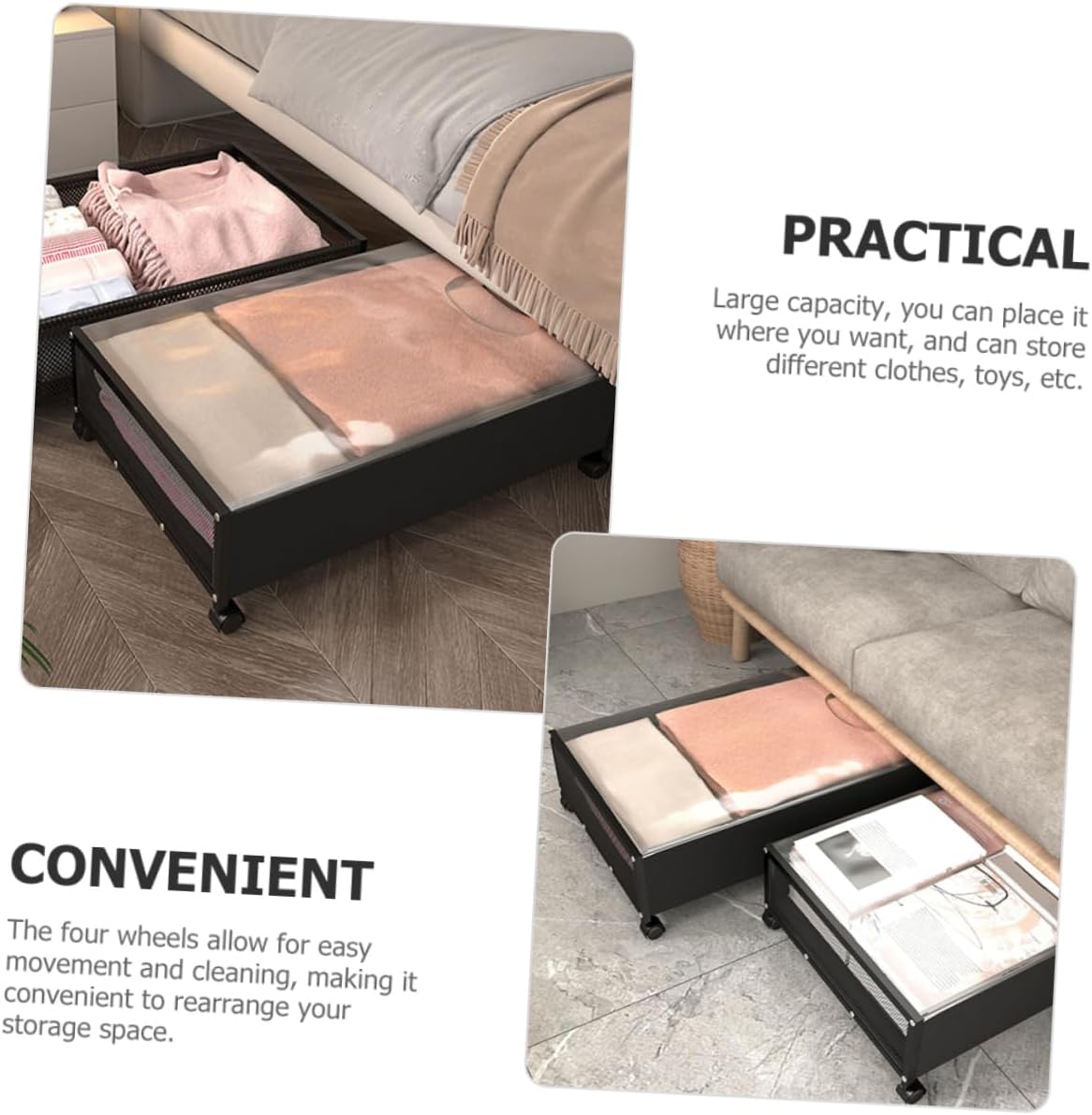 Package List 1 x Under Bed Organizer Features -Size:62.00X42.00X19.50cm/24.37X16.51X7.66in storage containers under bed -Material:Non-woven fabrics, iron, PVC under bed organizer -Color:Black underbed storage bins - It has excellent craftsmanship, is compact and practical, and will not be easily damaged underbed organizer containers. - Selected non-woven fabrics, iron, PVC materials, which can be safely and durably used long time under bed . - Large capacity, you can place it where you want, and can store different clothes, , etc storage bins for under bed. - Household Storage holder is very lightweight and nice-looking, can be placed in any corner of the home under bed storage bins. - The storage box is simple , but it's practical to use, which will give you a fantastic use experience storage bin under bed.Goods Descriptionstorage bins under bed The Convenient Bedside Storage Basket for Clothes, , Books, with a Cover is designed to provide for your bedroom.under bed storage container The four wheels allow for easy movement and cleaning, making it convenient to rearrange your storage space.underbed storage bins With its large capacity, you can easily store clothes, , books, and other items, making your room more organized