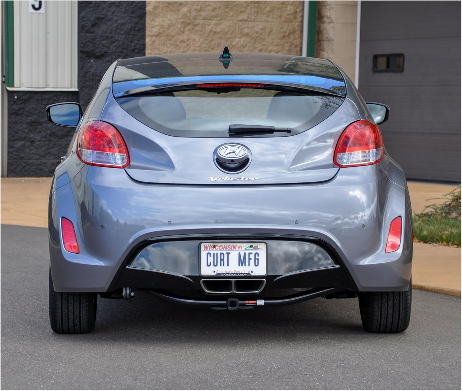 Connect to your lifestyle with a custom hitch receiver from CURT. All of our custom hitches are designed for a vehicle-specific fit, manufactured with pride, finished for industry-leading rust resistance and tested to rigorous SAE J684 standards for safety. This class 1 trailer hitch and ball mount combination is designed for a custom fit on select years of the Hyundai Veloster (see application info to verify fitment). The hitch integrates with the vehicle's frame and provides a useful and dependable 1-1/4" x 1-1/4" receiver. The receiver is perfect for attaching the included ball mount and towing a small trailer, or for adding cargo space with a hitch-mounted cargo carrier, bike rack or other accessory. This particular class 1 hitch is rated for 1,000 pounds gross trailer weight and 100 pounds tongue weight (never exceed the lowest-rated towing component). The ball mount included with this trailer hitch quickly and easily installs into the hitch receiver and has a 3/4" trailer ball hole (trailer ball not included). It can be mounted in the rise or drop position to promote level towing. Like all CURT custom hitches, this class 1 hitch is protected with our co-cured finishing process. It is descaled for a smooth surface, immersed in liquid A-coat for rust resistance inside and out, covered with a durable black powder coat and finally co-cured for an industry-leading rust, chip and UV-resistant shield. No matter where you're headed or which season of the year you’re towing in, this CURT hitch is equipped for long-lasting resilience to the elements. It features an open-back receiver for easy cleaning, and it comes with all the hardware necessary for the installation.