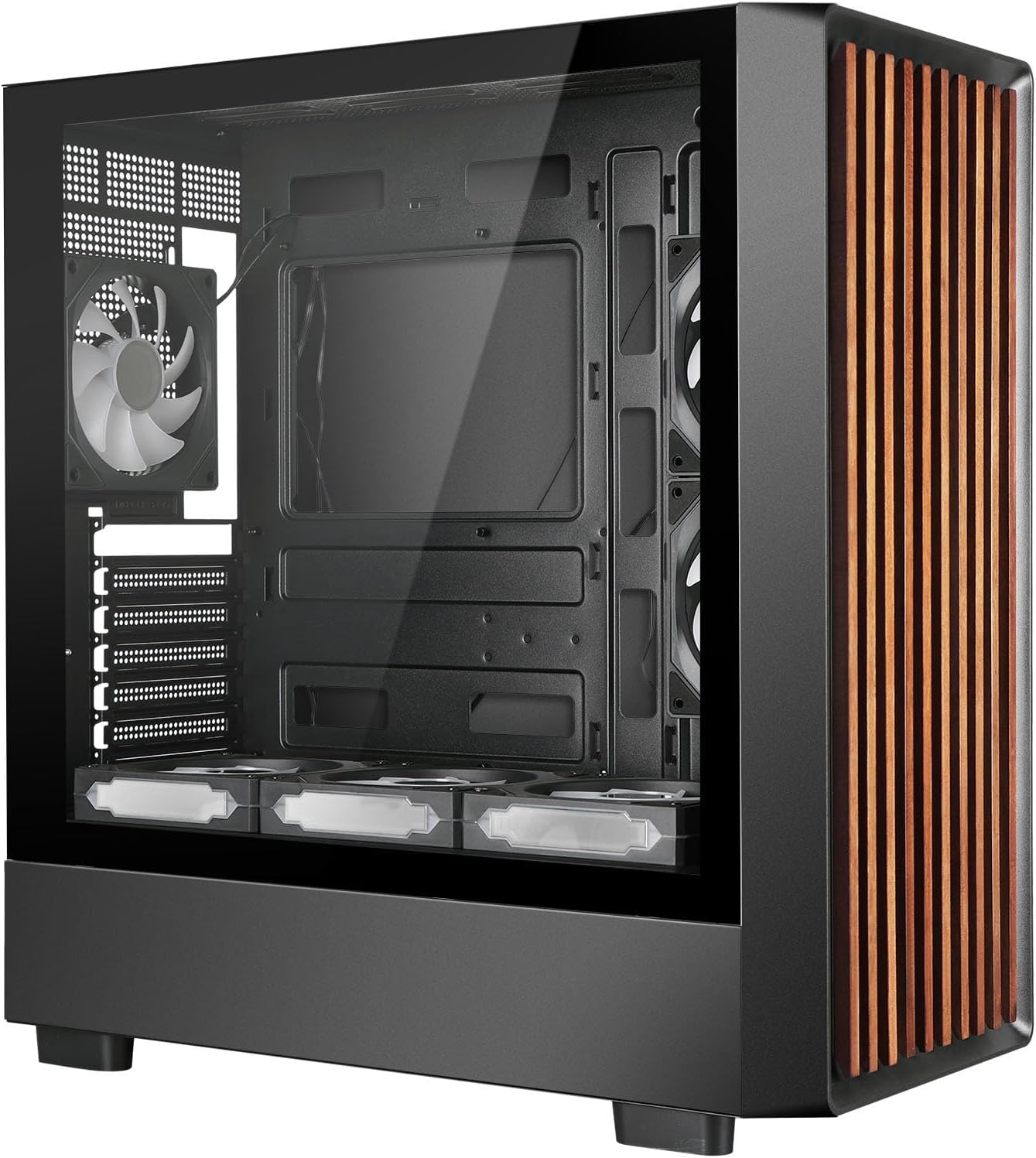 High Airflow Tempered Glass Side Panel Mid-Tower ATX Case Black without Fans."ATX Mid-Tower Case with Walnut Front Panel and Removable Tempered Glass Side Panels:This chassis features a hybrid design combining natural aesthetics and modern functionality. The front panel is crafted from premium walnut wood, providing a warm, organic texture that blends seamlessly with home or office decor. The side panels are made of 4mm-thick tempered glass, offering scratch-resistant transparency to showcase internal components while supporting tool-free removal for easy maintenance.Key specifications include:Motherboard Compatibility: Supports ATX, Micro-ATX, Mini-ITX motherboards.Cooling System: Can installed with 12 PWM fans (Top: 120mm*3 or 140mm*2 or supports 240/280/360mm radiators for advanced liquid cooling; Front: 120mm*3 or 140mm*3; Top of power compartment: 120mm*3; Rear panel: 120mm*1; Front side of motherboard: 120mm*2).Expansion: 7 PCIe slots with up to 420mm GPU clearance and 165mm CPU cooler height compatibility.I/O Ports: Includes USB 2.0, USB 3.0, and audio interfaces.The steel-reinforced frame ensures structural rigidity, while magnetic dust filters and mesh panels optimize airflow for efficient thermal management.