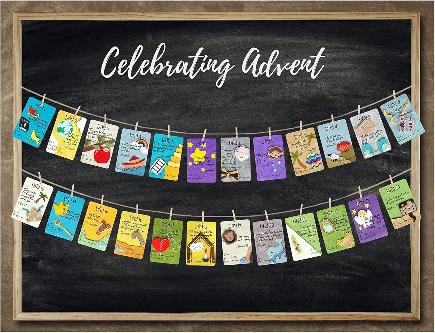 Celebrate Advent season by counting down the days to Christmas with this beautiful DIY felt Jesse Tree ornament kit. This DIY ornament kit was designed to correspond with the readings from the book, The Jesus Storybook Bible by Sally Lloyd-Jones (please note, the book is not included). Each ornament is lovingly crafted with high quality Celebrate Advent season by counting down the days to Christmas with this beautiful DIY felt Jesse Tree ornament kit. This DIY ornament kit was designed to correspond with the readings from the book, The Jesus Storybook Bible by Sally Lloyd-Jones (please note, the book is not included). Each ornament is lovingly crafted with high quality wool blend felt. The fine stitching, vibrant colors and beautiful detail make these ornament a timeless treasure for generations to come. Ornaments are pre-embroidered, all you will need to do is cut them out, trim any loose threads, and add bit of ribbon to complete your creation (ribbon not included). Perfect for beginners and seasoned crafters alike! Ornament size varies, but each one is approximately 2" at the longest length. Our Jesse Tree ornaments are a meaningful way to celebrate and prepare for Christmas with family or in the classroom. Perfect for daily devotionals, our Jesse Tree ornaments inspire thoughtful reflection and bring the Christmas story to life. Each stories helps to walk you through the lineage of Jesus, starting with creation and ending with his birth. During the month of December, we are reminded of God's plan to give us the gift of forgiveness and salvation through Jesus his son. Start a new family tradition this season—order your set today and experience the true spirit of Advent!24 Jesse Tree Ornaments *materials: felt, ribbon* size: each ornament is approximately 2” at the longest length after being cutout* includes: velour drawstring bag for storage* wooden display tree is sold separately in our storecopyright is owned by Baby WhatKnots LLC 2010-Current