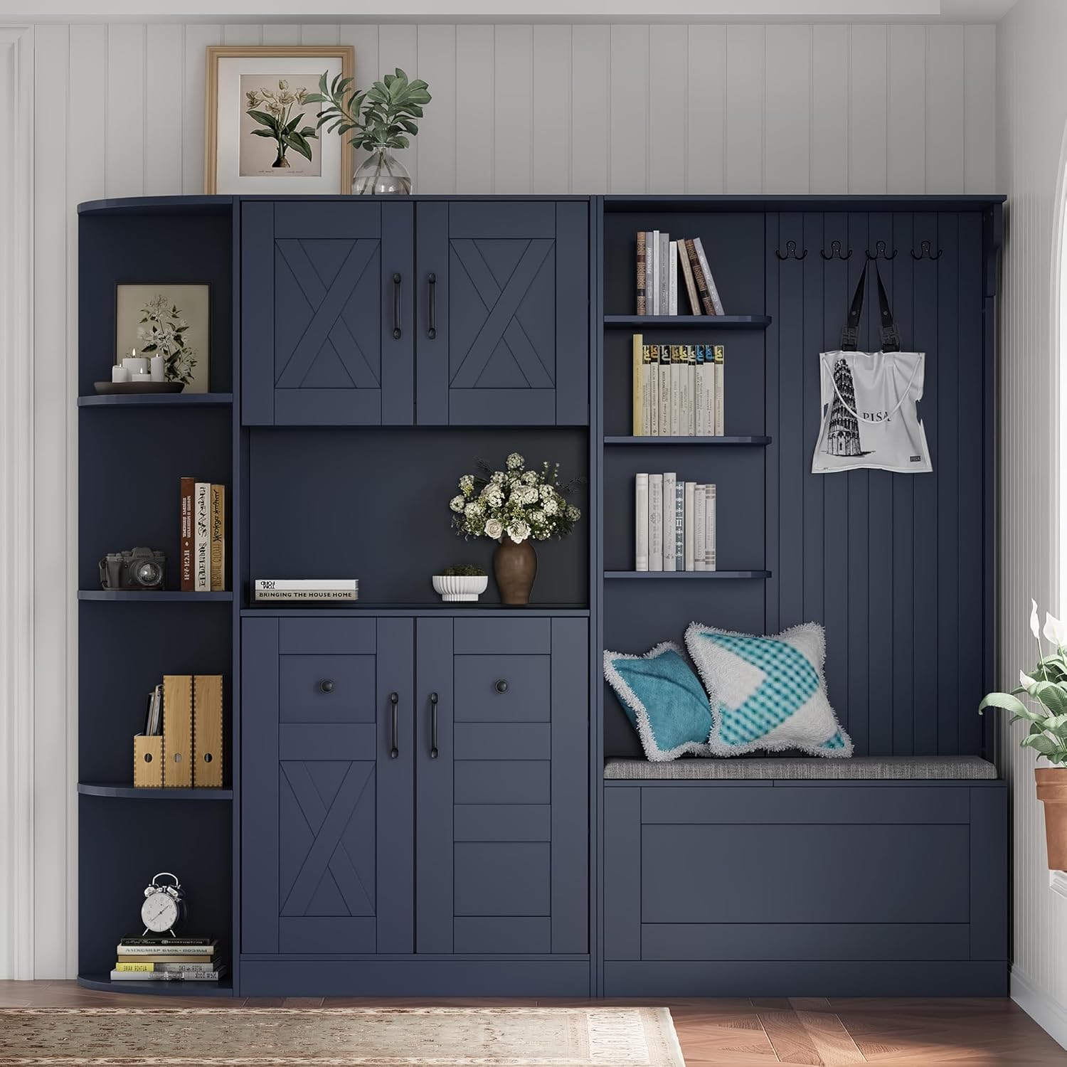 Whether you need a dedicated spot for changing shoes or a stylish way to organize your foyer, this versatile hall tree adapts to any room in your home. Product Name: Multifunctional left-right combination hall cabinet Overall Product Dimension: 74.8"L x12.6"W x 65.9"H Color: Black/Antique Blue/white/Beige Overall Product Weight: 194.23LBS Product Material: MDF+Particle Board Numbers of Package: 2 Weight Capacity: The left and right side cabinet open shelf holds 20 lbs, and the center open shelves can hold up to 40 lbs,and movable flap holds 40 lbs Number of Cabinets: 5 Number of Shelves: 8 Country of Origin: China Notes: Manual measurement has been used, there may be some reasonable error. All the pictures are taken by actual samples, slight.