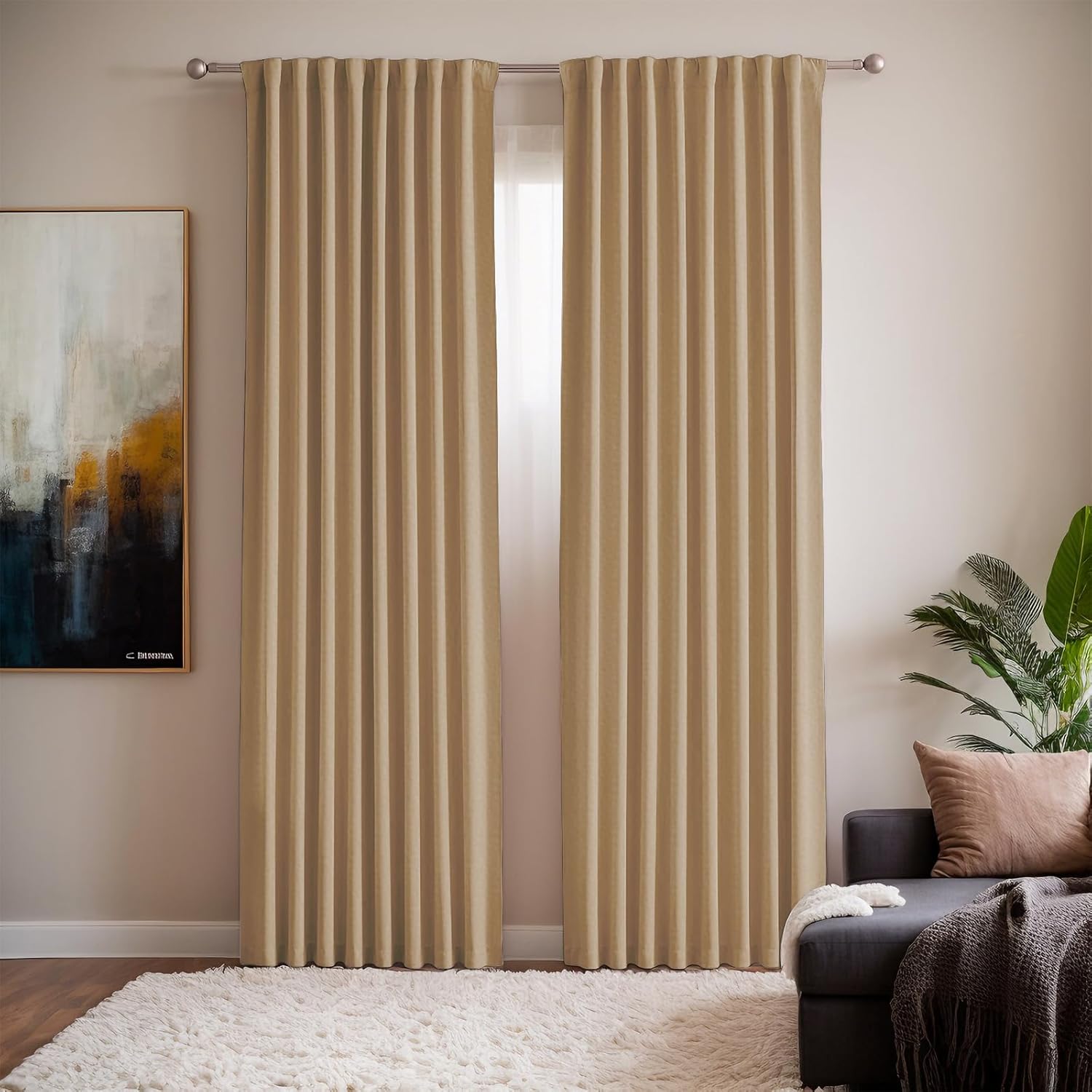 Extra Wide Curtain Panels:The package contains one room divider curtain panel equipped with hooks. Extra wide curtain dimensions: 100 inches Wide x 108 inches Long. Blackout Privacy Curtains: The fabric of the room divider curtain is made of innovative triple-weave 230GSM polyester, which is thick enough to block 85-99% of sunlight and UV rays, especially with dark colors for optimal. By hanging these room darkening blackout curtains in your bedroom, you will enjoy a superior sleep experience. Soundproof Thermal Curtains: These room divider curtains exceed ordinary ones in thickness, boasting a 12% higher sound absorption rate and a 15% improved heat insulation effect compared to other curtains. Suitable for Both Ceiling Track Systems and Rods: These room divider curtains can be hung from floor to ceiling on either wall-mounted ceiling tracks or rods. These floor to ceiling curtains are commonly used in a variety of settings, including patio glass doors, living rooms, bedrooms, closets, bars, and offices. Care Instructions: Machine wash in cold water on a gentle cycle. Hang to dry or opt for dry cleaning. Avoid using bleach. cortinas corredizas grandes para dividir sala y cuarto _ paneles cortinas divisoras para habitacion _ cortinas separadoras de habitacion _ room dividing curtain _ partition curtain _ room divider curtains for ceiling track system or rod with hooks