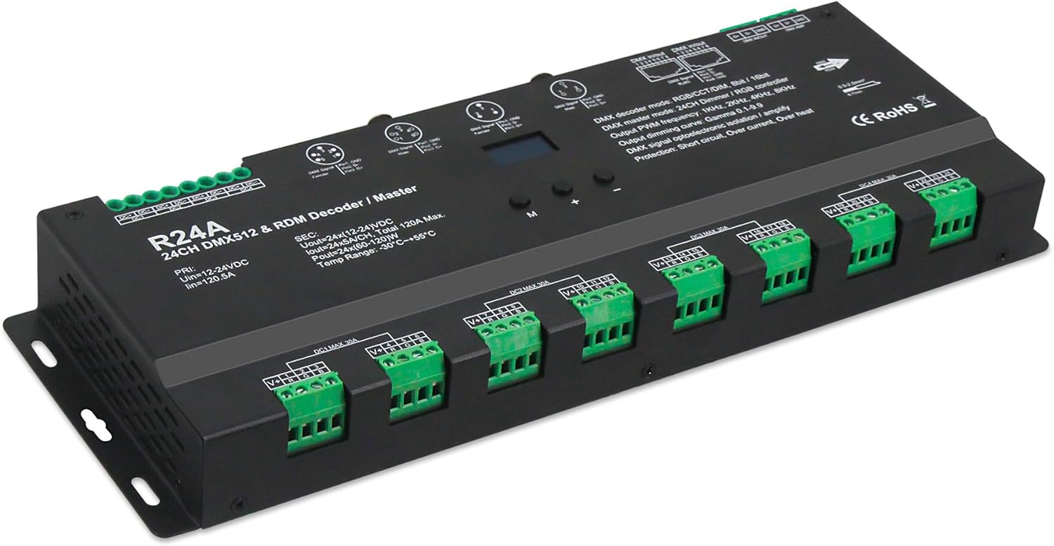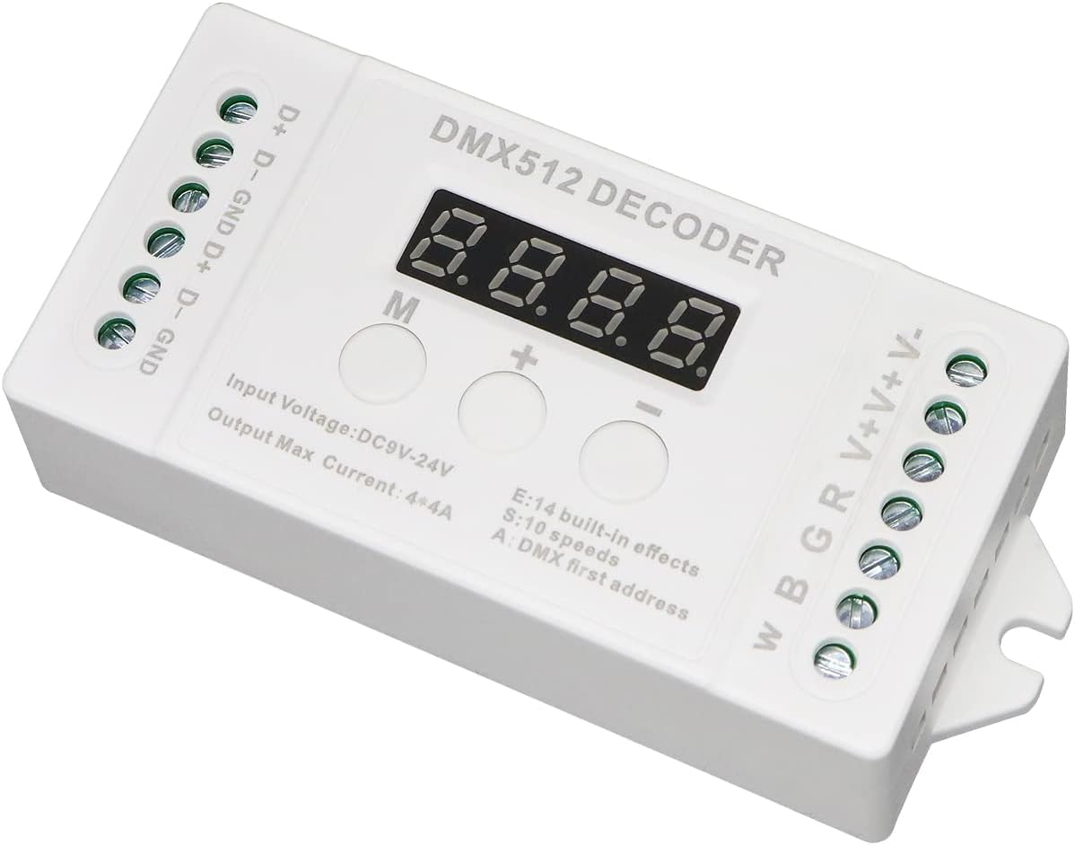 Product Description The DMX decoder uses advanced computer control chips to receive the internationally widely used DMX-512 standard digital control signal and convert it into a PWM controller signal to drive the LED; It can be connected with DMX digital console, and decoders can be added to continuously expand output channels to achieve more dimming or various program change effects. When the decoder is not connected to the DMX console, this unit can be used as a synchronous controller to synchronously control multiple decoders and LED lights. In addition, LED digital tubes are used to display the address code, and the code address increase or decrease can be set by buttons. It has the characteristics of flexible and convenient operation and clear display.