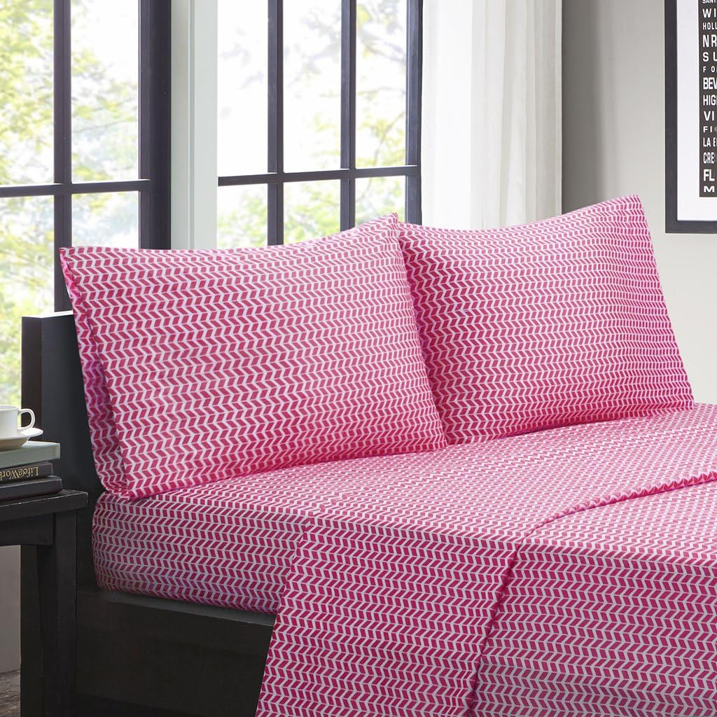 The Intelligent Design Chevron Printed Microfiber Sheet Set adds a bright and colorful style to your bedroom. This microfiber sheet set is naturally wrinkle-free and flaunts a vivid chevron print creating a fun and cheerful look. These sheets are also OEKO-TEX certified, meaning they do not contain any harmful substances or chemicals, ensuring quality comfort and wellness. Set includes: 1 Flat Sheet, 1 Fitted Sheet, and 2 Pillowcases (1 in Twin/TwinXL). The fitted sheet fits up to a 14-inch mattress.
