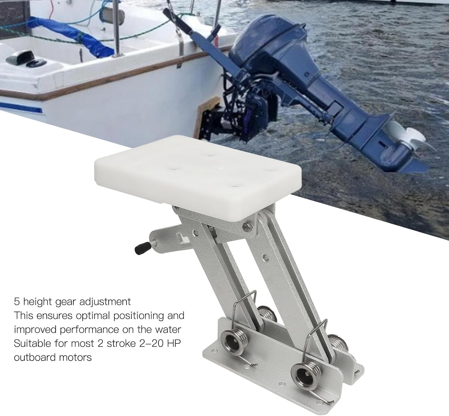 Item Type: Outboard Motor Bracket MountMaterial: AluminumHeight Adjustment: 5 levels for maintaining running heightApplication: These fully adjustable mounts feature a sturdy design and smooth, spring assisted action to quickly and easily lift auxiliary kicker motorsApplication: Suitable for most 2 stroke 2-20 outboard motorsPackage List:1 x Aluminum Outboard Motor Bracket