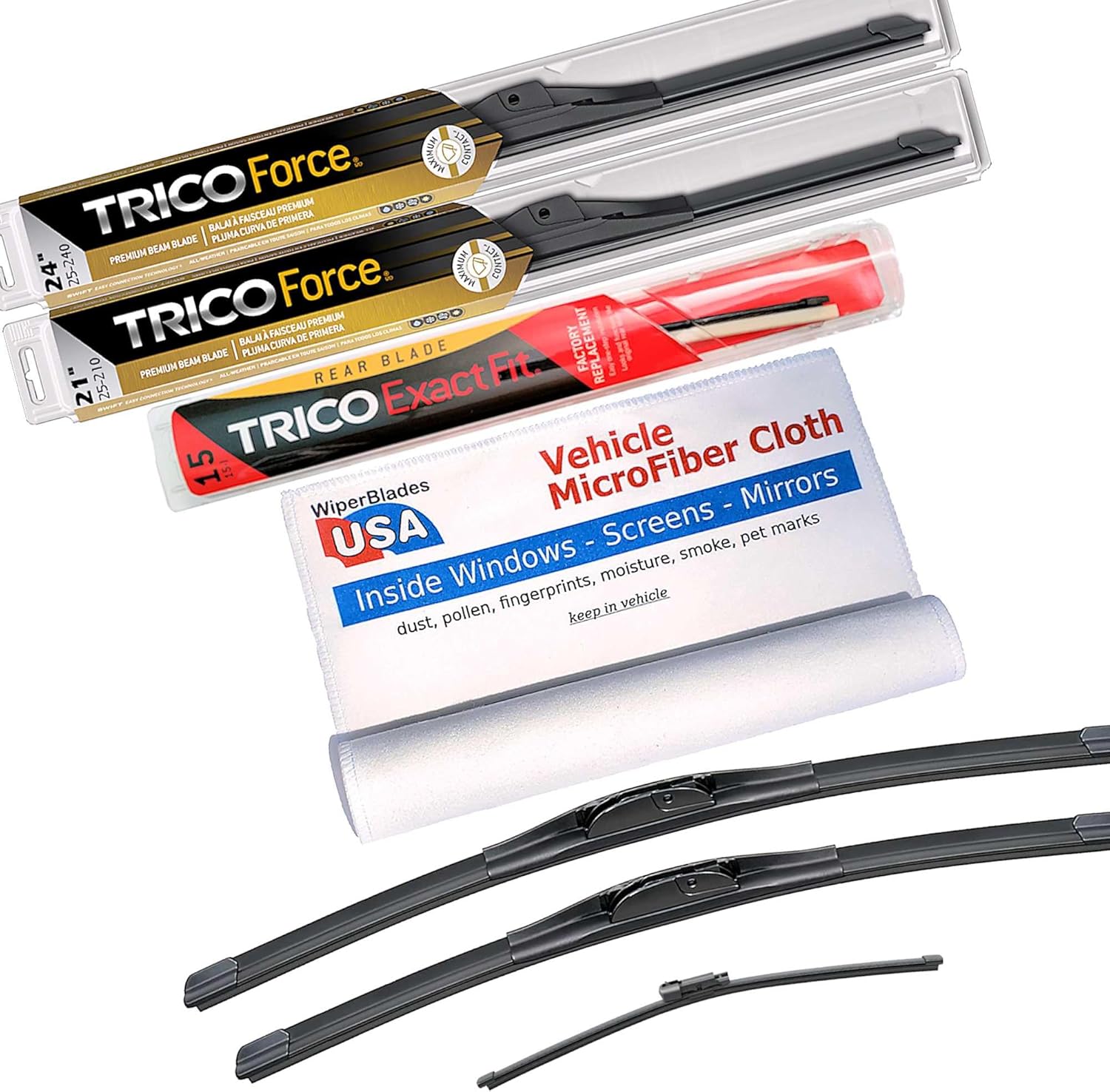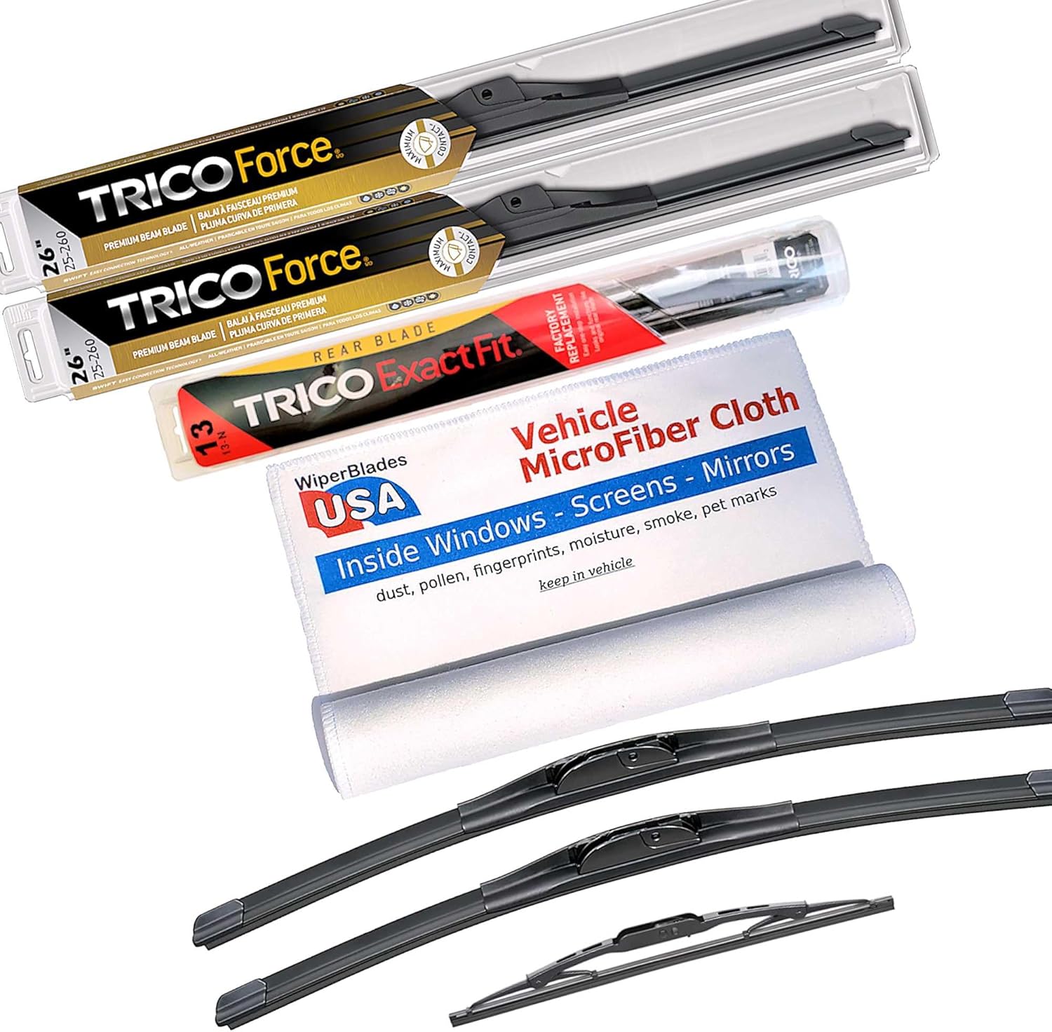 Premium Beam Wiper Blades set +Trico ExactFit Rear wiper. Compatible with Porsche Cayenne 2019Trico Force Premium Beam Wiper Blades - "Turning wind force into wiper pressure" These Trico Force Premium Beam Wiper Blades are a great choice and are compatible with your Porsche Cayenne 2019 because: When you need "extra" pressure on your wiper blades to keep them stable on your large curved windshield then Trico Force is the premium beam blade for you. Trico Force Wipers are robustly engineered beam blades with a patented swept-wing spoiler that slices through turbulence caused by cross winds, buffeting truck winds and general traffic disturbances. Designed with an innovative aerodesign, these high performance wiper blades control airflow and transfer it into maximum wiper/glass contact for a flawless wipe, providing excellent visibility in all driving situations. VorTec aerofoil converts wind force for maximum windshield contactHighGlide treated rubber element for a smoother, quieter wipeRobust super-structure for durable all-weather performance Memory Curve Steel® beamSWIFT® Easy Connection TechnologyTested to perform over 1.5 million cyclesAnd Trico is the #1 wiper manufacturer in the United States. So you know you can depend on them.