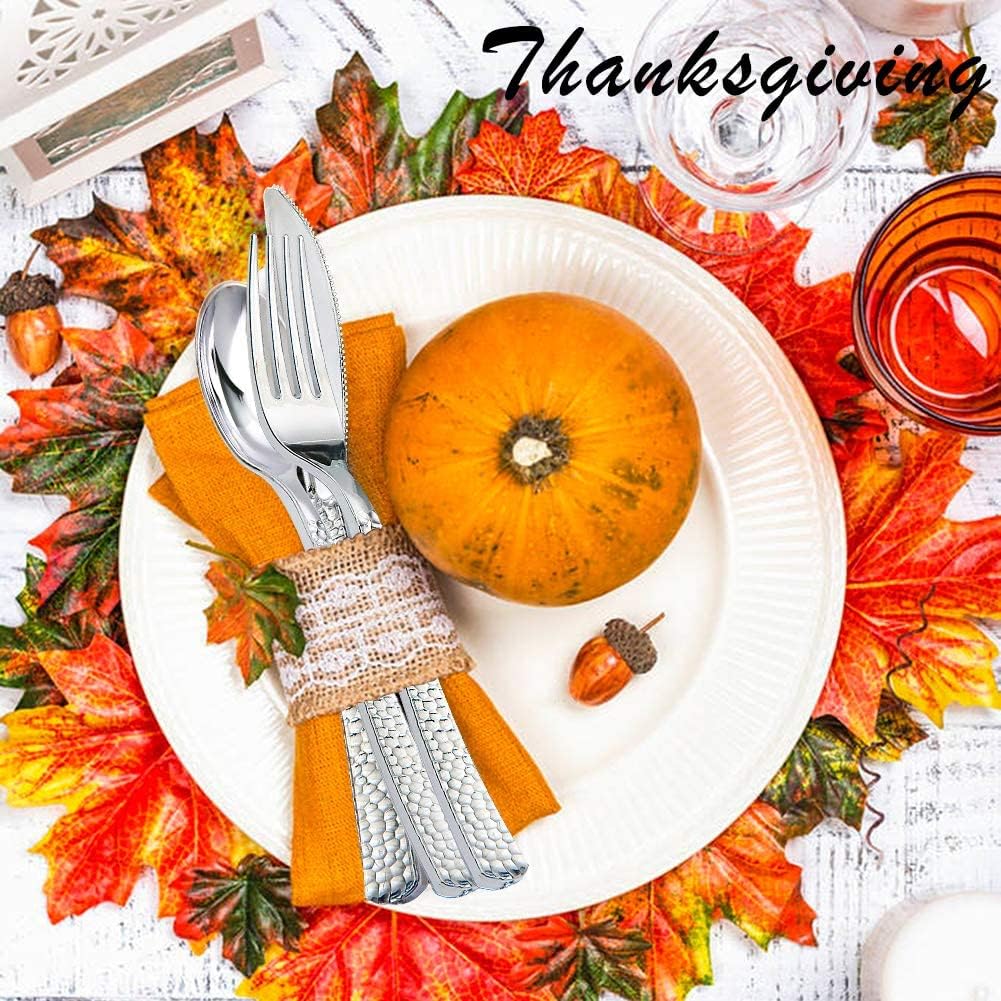 Silver Plastic Cutlery Disposable Dinnerware set include: 7.4 inch silver plastic polished forks: 420 pieces 6.9 inch silver plastic polished spoons: 120 pieces 7.8 inch silver plastic polished knives: 120 pieces