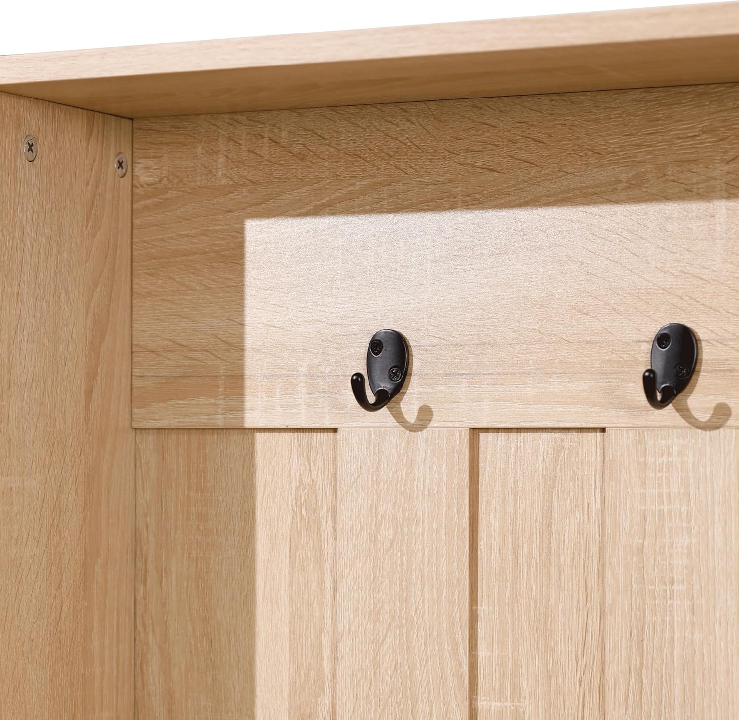 Organize your high traffic areas while adding high style with this updated version of the classic hall tree. Lower divided storage cubbies that feature adjustable shelves along with 3 metal coat hooks provide a place for neat and tidy storage of essential items . The flared side details along with the decorative beadboard paneling lends elegance to this storage bench. Comprised of strong and sturdy engineered wood, the storage bench accommodates up to 200 lbs. static weight and each storage cubby holds up to 20 lbs. static weight. This modern hall tree includes step-by-step assembly instructions and wipes clean with a damp cloth for easy upkeep.