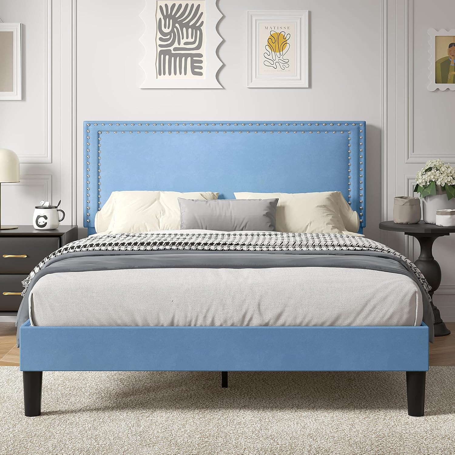 VECELO Upholstered Bed Frame, Platform Bed Frame with Adjustable HeadboardModern Style--The simple design style velvet upholstered headboard is not only comfortable but also brings you a warm and soft atmosphere, the elegant and classic design can be perfectly matched with various home decorations.Adjustable Height-- The headboard comes with 4 height adjustable mounting positions from 41'' to 47'', suitable for any thickness and material mattresses. Under bed clearance provide extra storage space,also can clean easily.No Box Spring Needed--Metal frame and 12 wood slats support platform to extend the life of your mattress, This upholstered bed frame suitable for all kinds of mattresses, spring, memory foam, latex, or hybrid mattress.Noise-Free Design--This metal frame uses foam padding inside, with strong support legs clearance to enjoy a good nights sleep for the perfect noise-free bed frame.Easy To Assemble--This bed is quick to set up, all parts, tools, and assembly instructions are included. Just follow the picture step by step.Specification:Size: Twin / Full / QueenColor: Blue / Gray / Pink / Green / ‎Beige / WhiteMaterial: Velvet + Metal + WoodAdjustable Height of Headboard: 41-47inchGround Clearance: 7.8 inchMax Load Capacity: 500 / 700 / 800 lbsProduct Weight: 59 / 66.3 / 74lbsSlat Spacing: 3.7"Box Spring Required: No8-14inch mattresses are recommended.Package include:1 x Bed Frame1 x Accessory bag1 x Assembly InstructionsNotes:1.VECELO provides 24-month warranty and 30-day free return service.2.If there's any problem with the products you received, please feel free to contact us to get free replacement parts or a brand-new item.