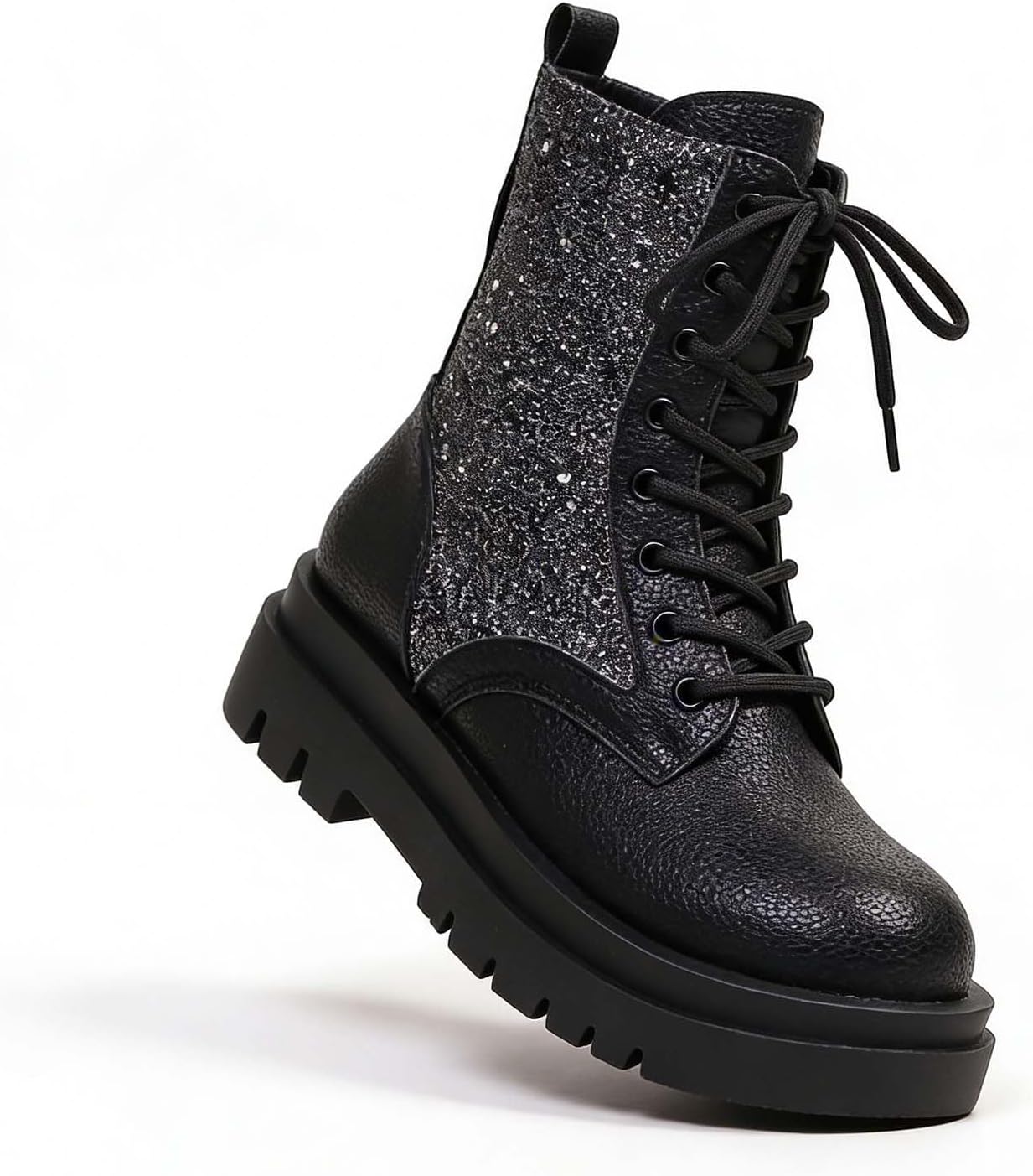 Specifications: Item Name: Sparkly Combat Boots For Women Upper Material: PU Lining Material: Fabric Sole Material: Rubber Heel Type: Platform Platform Height: 2.16 in/5.5 cm Shaft Height: 5.9 in/15 cm Closure Type: Lace Up Decor: Glitter Colors: Black, Silver-Grey, Red, Silver, Brown Package Includes: 1 Pair* Glitter Ankle Booties For Women Note: 1. Due to the different display and different light, the picture may not show the actual color of the item. Thanks for your understanding. 2. Please allow slight differences due to manual measurement.