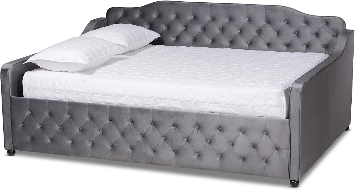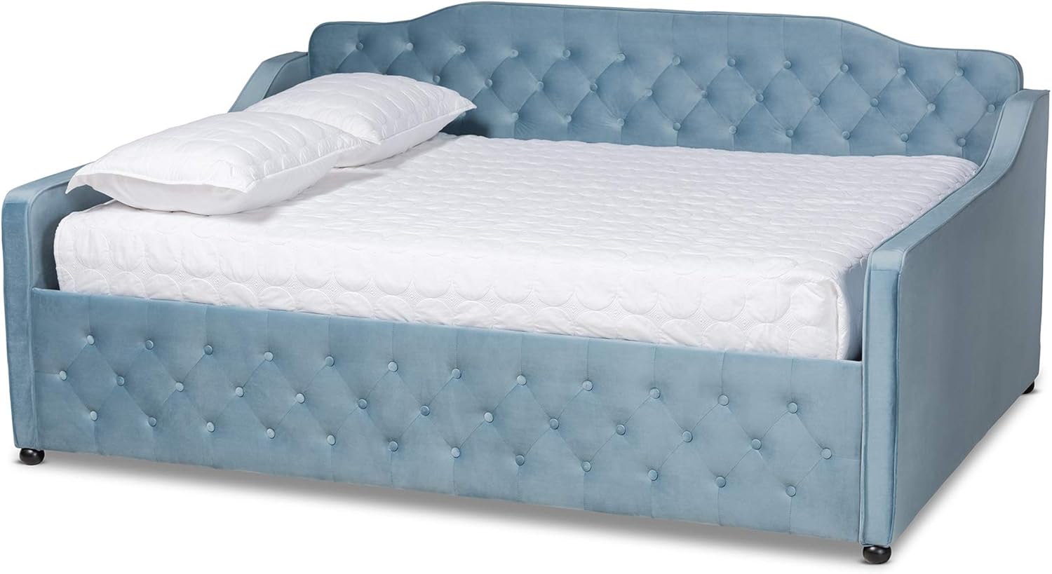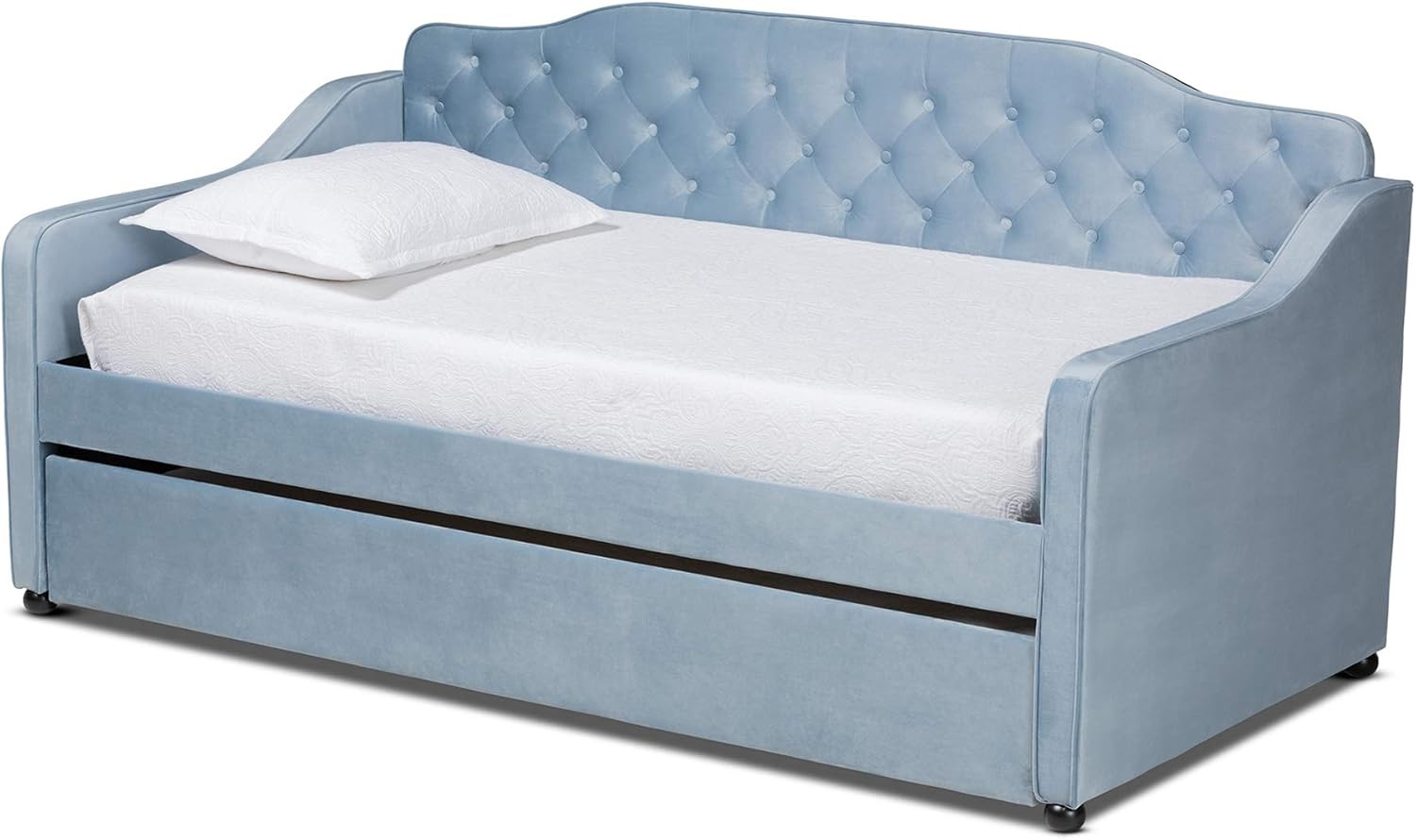Lounge and sleep in style with the Freda daybed. This versatile piece is fitted with a pull-out trundle to provide convenient accommodation for overnight guests. Its sturdy wooden frame is padded in foam and upholstered in a soft, sumptuous velvet fabric that provides ample comfort for resting. Button tufting and piping accentuate the stunning tones in the velvet, while black ball feet lend a sleek touch. The Freda daybed is made in Malaysia and requires assembly.
